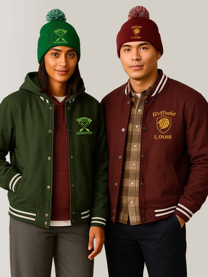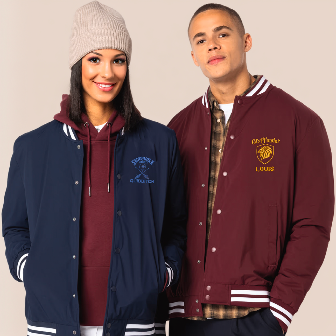 Découvrez notre veste teddy premium, personnalisable et entièrement brodée aux couleurs des célèbres maisons de l’univers Harry Potter.